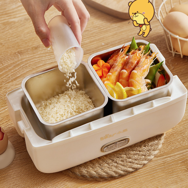 Với hộp cơm điện cầm tay Bear DFH-B17K2, người dùng có thể hâm nóng thức ăn nấu chín từ trước và có ngay bữa ăn nóng sốt chỉ trong 10 phút. Trường hợp người dùng muốn nấu cơm và thức ăn ngay tại văn phòng, chỉ cần cho thực phẩm đã sơ chế cùng với gạo + nước vào trong thiết bị rồi cấp nguồn và bắt đầu nấu. Bữa ăn nóng sốt dành cho bạn sẽ sẵn sàng trong 45-60 phút.