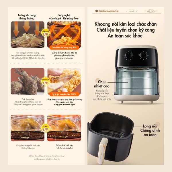 Bear luôn quan tâm đến sức khoẻ của người tiêu dùng, luôn đặt sự an toàn cả khách hàng lên hàng đầu. Lựa chọn chất lượng kỹ lương nhất có thể, lớp vỏ nhựa PP cao cấp, có thể chịu được nhiệt độ cao và đặc biệt không chứa chất gây ung thư.Lòng nồi được phủ lớp chống dính cao cấp, khi bạn chiên thức ăn không lo bị dính thức ăn vào bề mặt nồi. Khác với các loại sản phẩm khác nồi chiên không dầu YOICE Y-KZ18 luôn luôn làm tốt nhiệm vụ của nó, luôn đạt tối da hiệu quả. Tất cả các linh kiện cấu thành nên sản phẩm đều là loại cao cấp vì thế nồi chiên không dầu YOICE Y-KZ18 được nhiều khách hàng tin tưởng và lựa chọn.